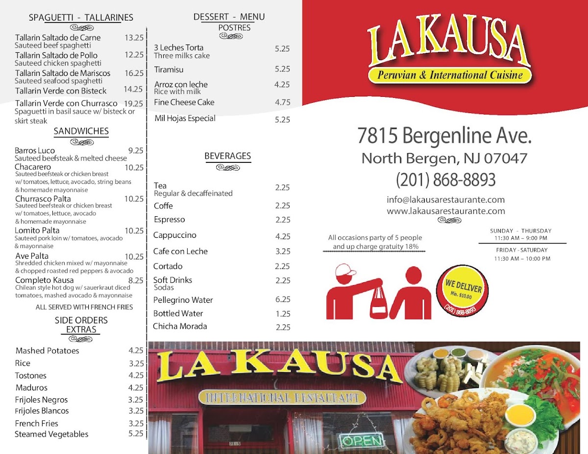 If you're looking to try something new and exciting, La Kausa Restaurant Menu has something for everyone. Located at 7815 Bergenline Ave Suite 2, North Bergen, NJ, this spot brings a fresh take on traditional flavors with an eclectic mix that will make your taste buds dance. Whether you're craving a hearty meal or something light and fresh, there’s no shortage of options. From savory appetizers to bold, flavorful entrees, each dish is crafted with care and the best ingredients. It’s the kind of place where each visit feels like discovering a new favorite dish. The vibe is relaxed, making it perfect for a casual meal with friends or family. Whether you’re here for a quick bite or to savor a longer meal, you’ll find something to enjoy at La Kausa.